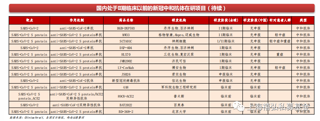 - 国内尚有近30个新冠中和抗体处于二期临床以前的早期研究阶段,其中3个处于II期、I/II期临床,4个处于I期临床,其他均在临床前。