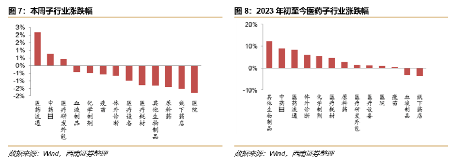本周医药生物指数下跌0.37%,跑输沪深300指数2.08个百分点,行业涨跌幅排名第25。2023年初以来至今,医药行业上涨4.45%,跑输沪深300指数2.23个百分点,行业涨跌幅排名第22。